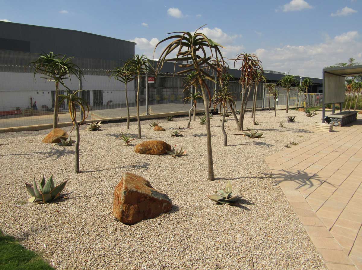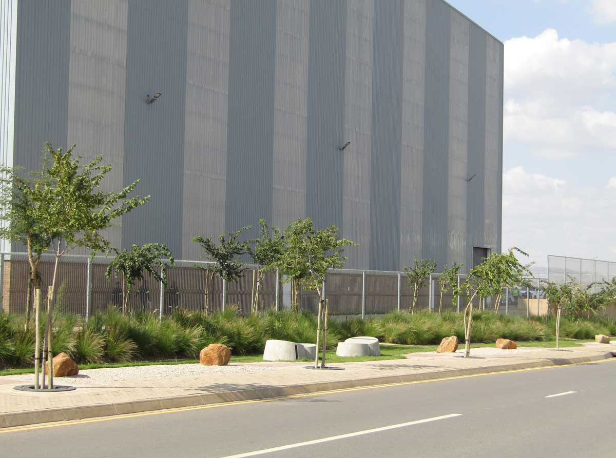 c) Socio – economic aspects of the project included does offer labour benefits i.e. job creation plus boosting the local economy. Challenges facing the design team was and it would prove difficult to create a ‘lush and full landscape experience’ in and an otherwise harsh industrial environment. With the focus on the effective use of contrasting natural materials, the idea was to create textural variances and organic land massing to enhance the user experience.
