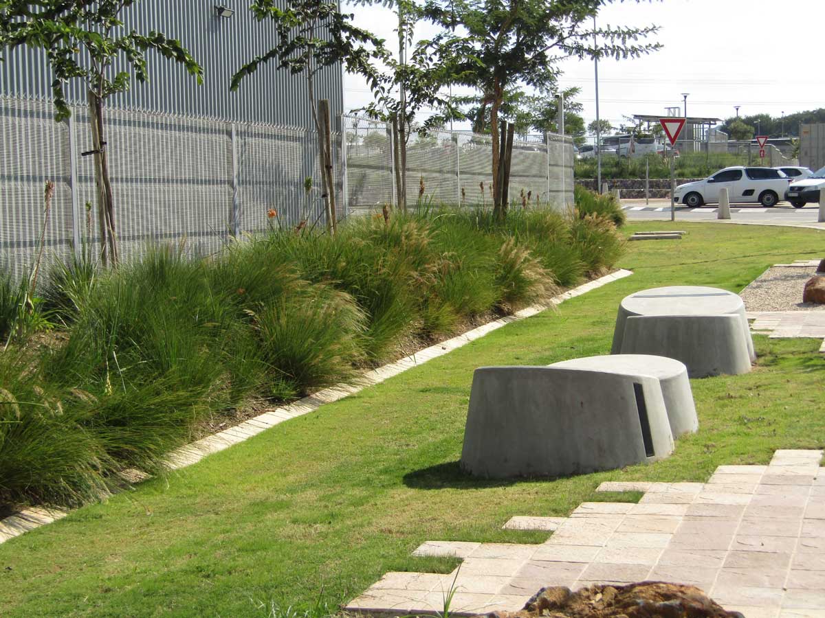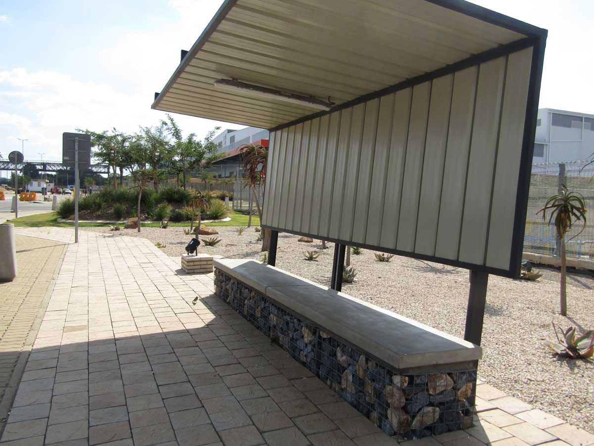 The existing adjacent wetland and key environmental aspects included rehabilitation plus *An EIA was conducted for the project and one of its outcomes was compliance with an environmental management plan report (EMPr)” Hard landscape elements include gabion walls, natural boulders from site, custom bus shelters and custom pre-cast seating and bollards.